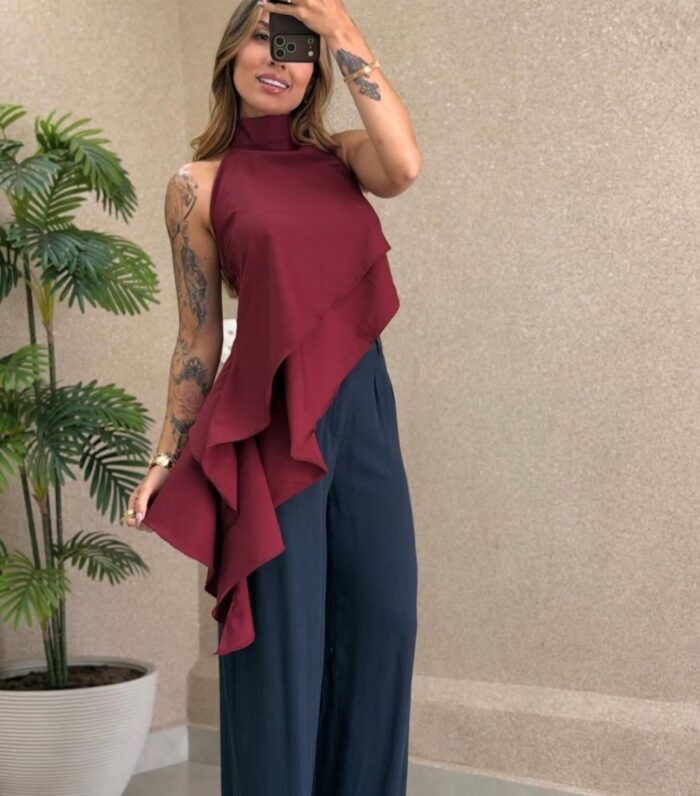 - Detalhe de babados assimétricos;