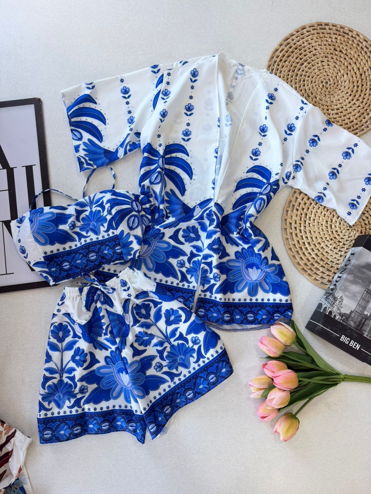 - Conjunto composto por 3 peças top, shorts e kimono;