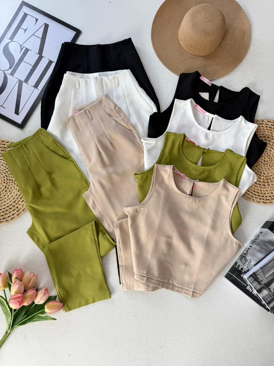 Calça: cintura 30 cm, largura/perna 32 cm cada, comprimento 107 cm
