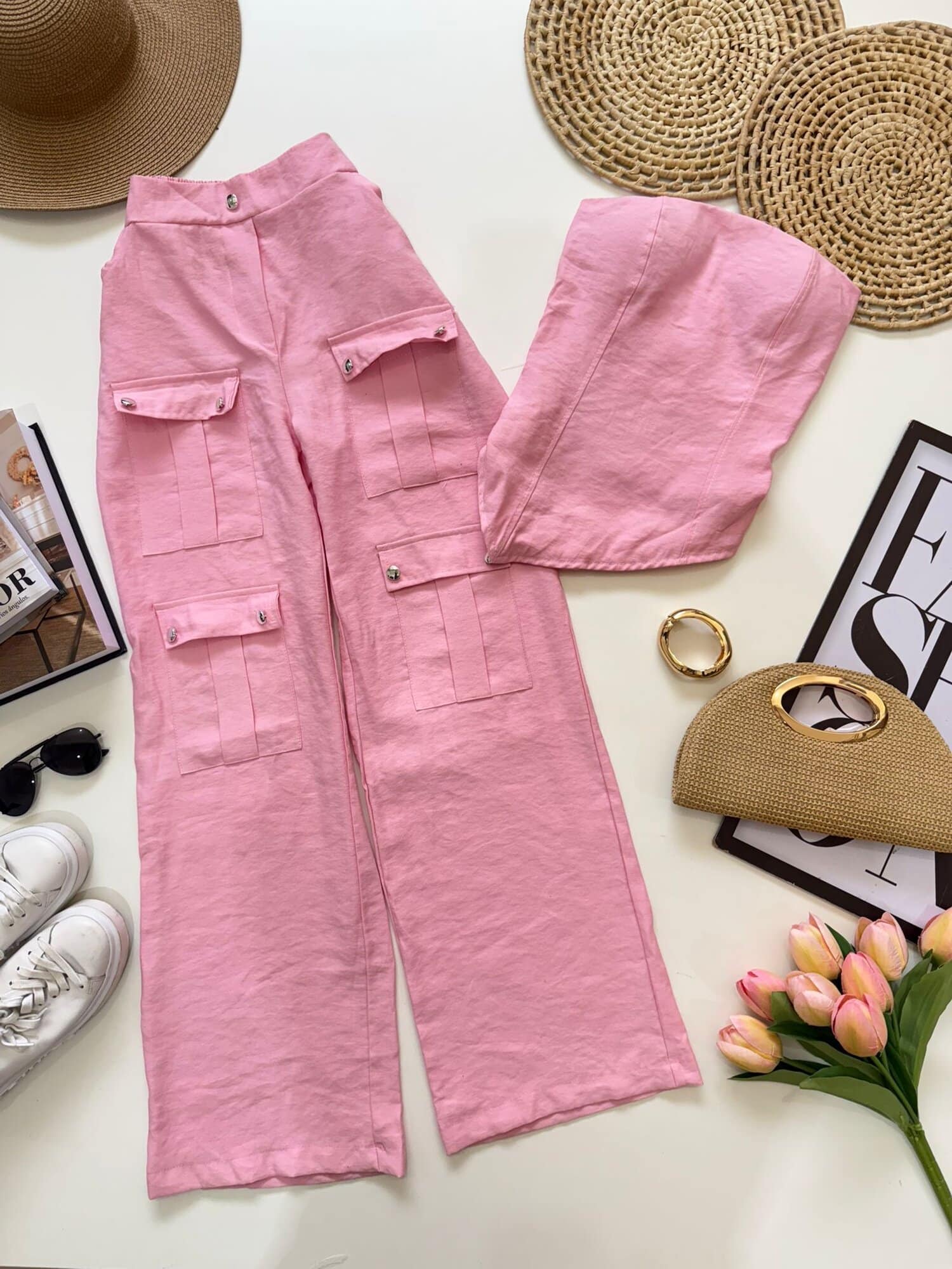 Conjunto 2 peças: blusa tomara que caia com bojo + calça cargo;