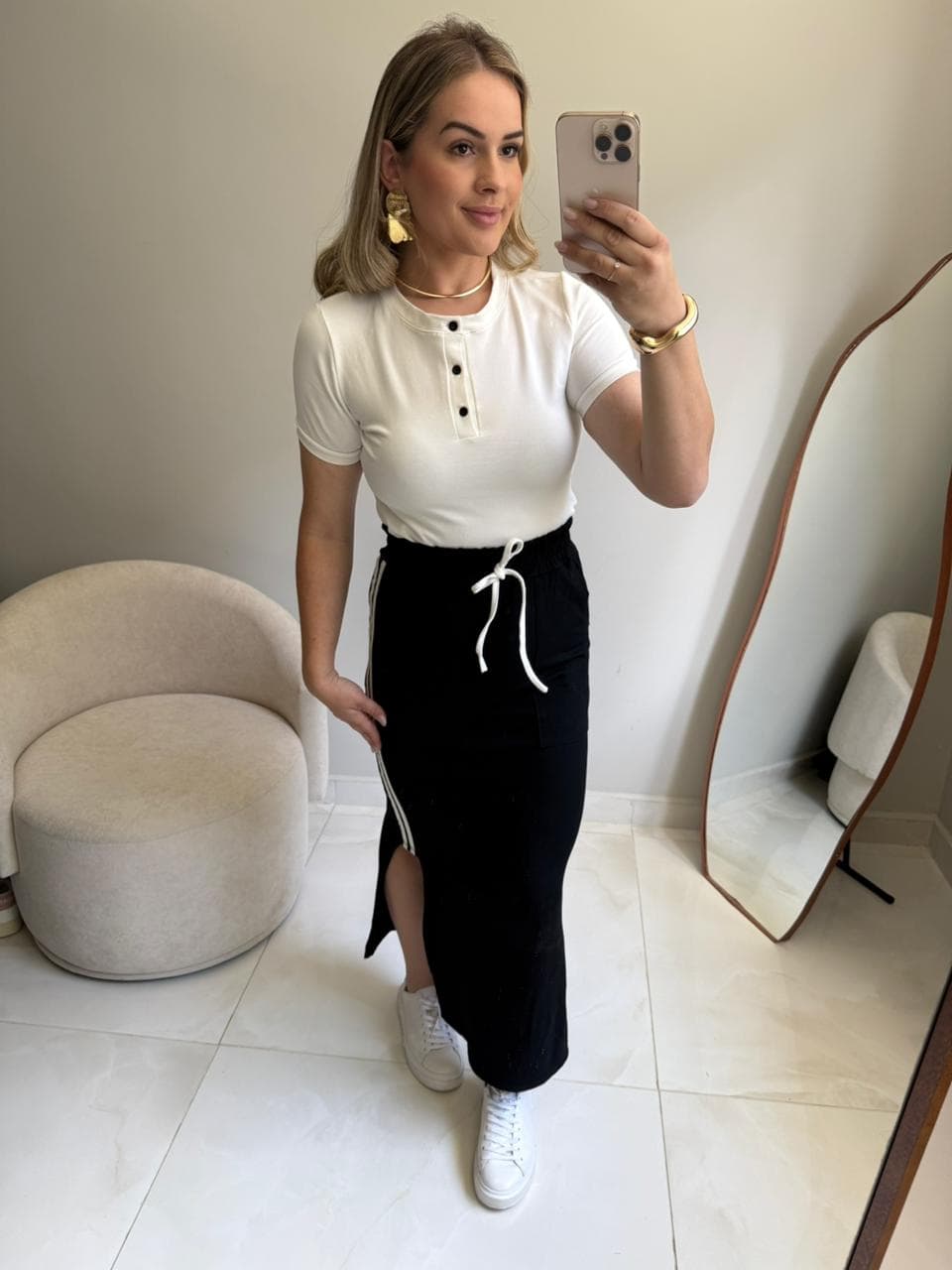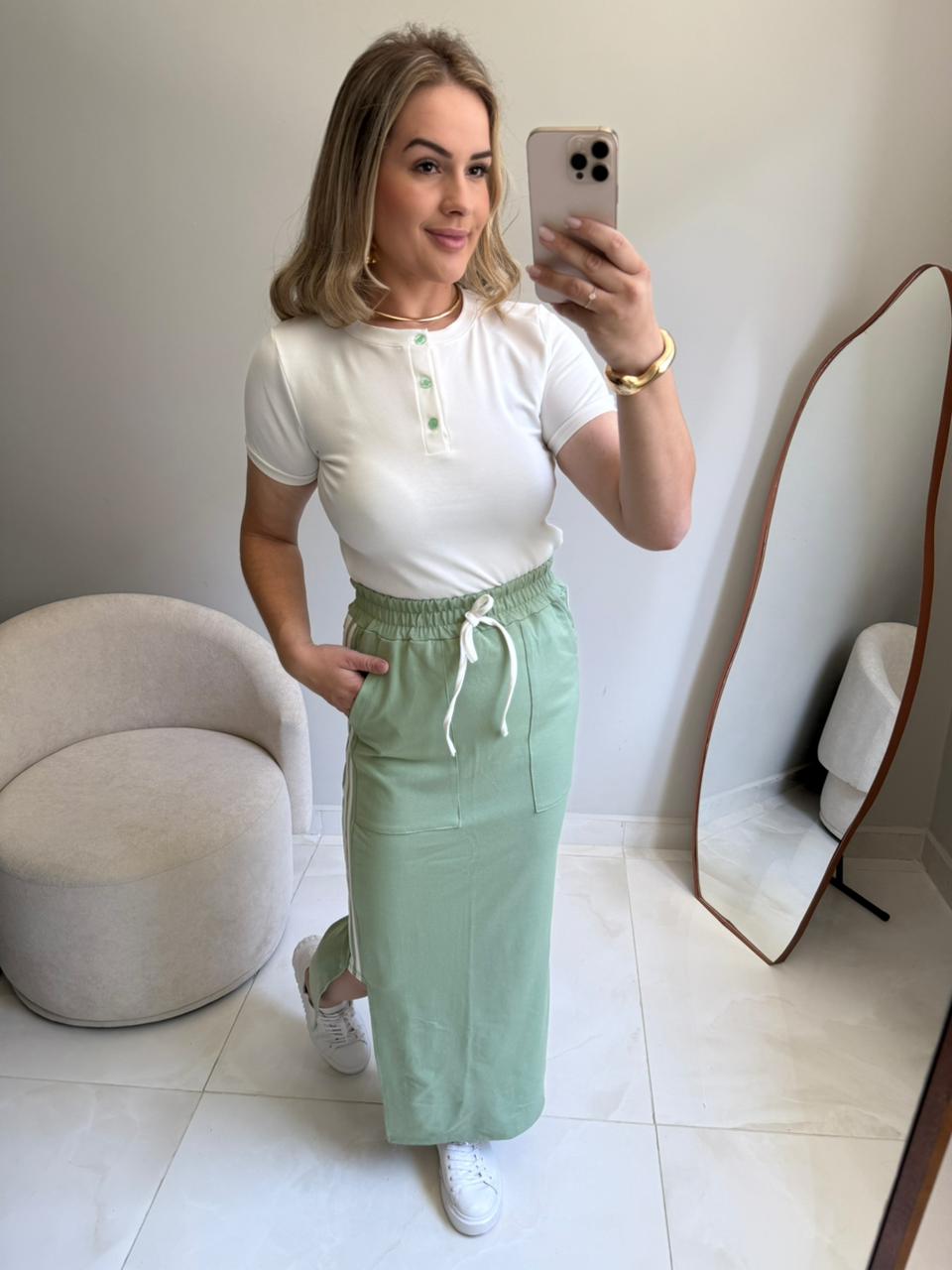 - A saia midi tem cintura alta com elástico;
