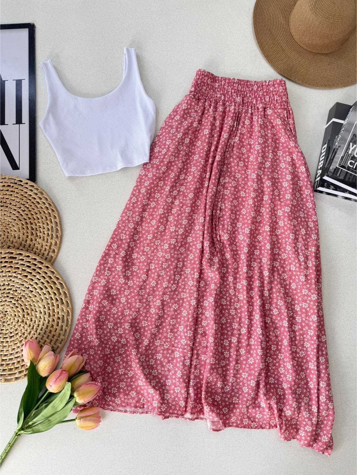 - Saia midi com estampa delicada floral;