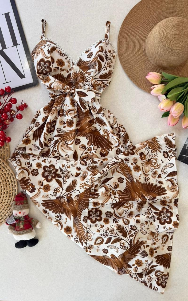 Modelo longo; Modelo com estampa floral; Modelo possuí forro; Não possuí bojo; Decote em V; Faixa do mesmo tecido para amarração frontal; Alças finas ajustáveis; Lastex nas costas; Leve babado no comprimento; Tecido leve e confortável; Medidas fora do corpo e sem esticar : Busto 33 cm, cintura 38 cm, comprimento 135 cm Tamanho único…